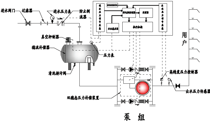另外如設(shè)備原理圖所示,通過(guò)微機(jī)控制、雙穩(wěn)態(tài)壓力補(bǔ)償裝置及真空補(bǔ)償系統(tǒng),使本設(shè)備可以和自來(lái)水直接串接,因水泵工作的疊加原理,使設(shè)備可以充分利用自來(lái)水原有的壓力,增加了變頻調(diào)速給水設(shè)備的節(jié)能點(diǎn)。當(dāng)自來(lái)水壓力不足致使壓力下降時(shí),本設(shè)備通過(guò)真空抑制器及穩(wěn)流補(bǔ)償器中的檢測(cè)裝置采集穩(wěn)流補(bǔ)償器內(nèi)的水位信號(hào),通過(guò)微機(jī)控制真空抑制器及雙穩(wěn)態(tài)壓力補(bǔ)償裝置中的的特殊裝置動(dòng)作,抑制負(fù)壓的產(chǎn)生,保證設(shè)備不對(duì)城市管網(wǎng)產(chǎn)生任何影響。